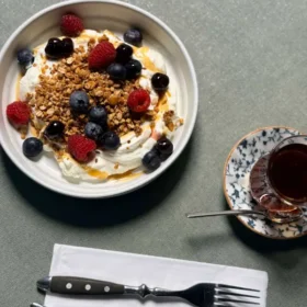 Overdag ben je welkom voor ontbijt en lunch met eiergerechten, versgebakken brood, lichte salades en zoete of hartige gerechten. In de middag en avond staat samen eten centraal, met gerechten om te delen, warme pan- en grillgerechten, pasta’s en zorgvuldig samengestelde hoofdgerechten met vlees, vis of groenten.